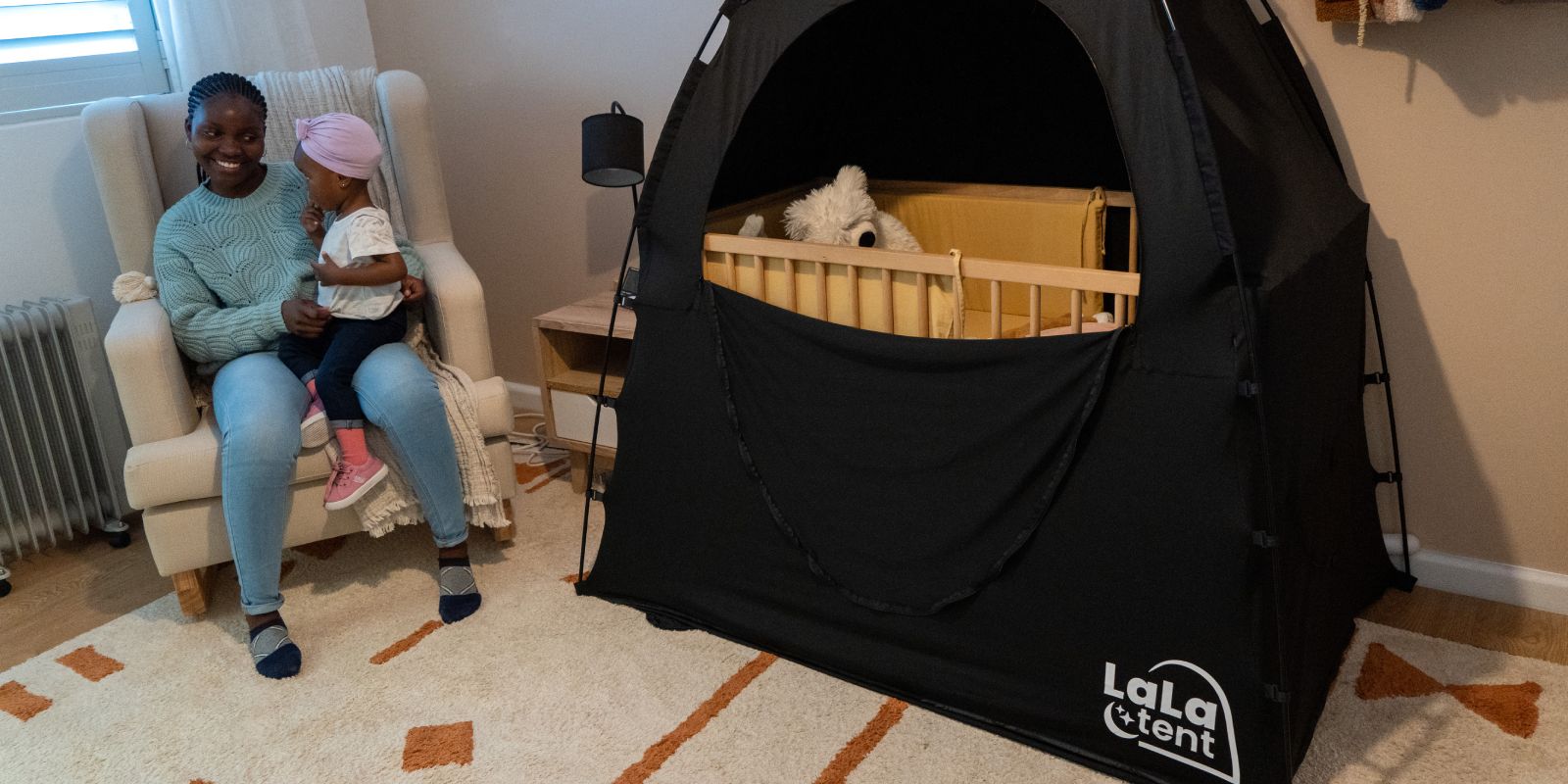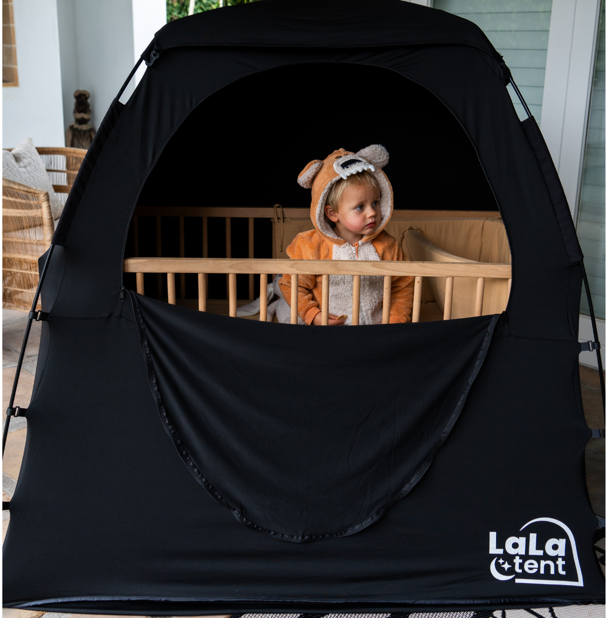 LalaTent is a portable blackout crib cover that allows babies to sleep in their safe and familiar playard, mini crib or toddler air mattress with room to sit up or stand up inside.